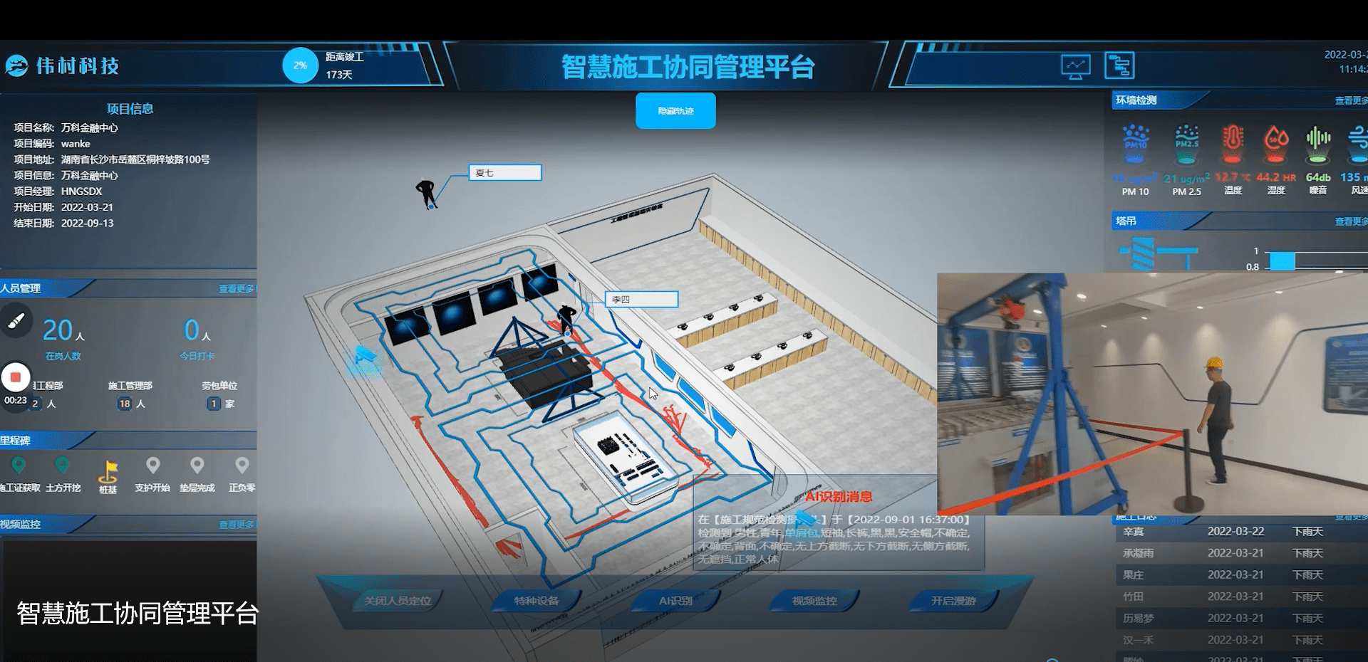 (1) 将智慧施工过程中的人员定位情况,视频监控,进度情况等信息进行可视化展示,并且结合BIM模型进行三维可视化呈现。